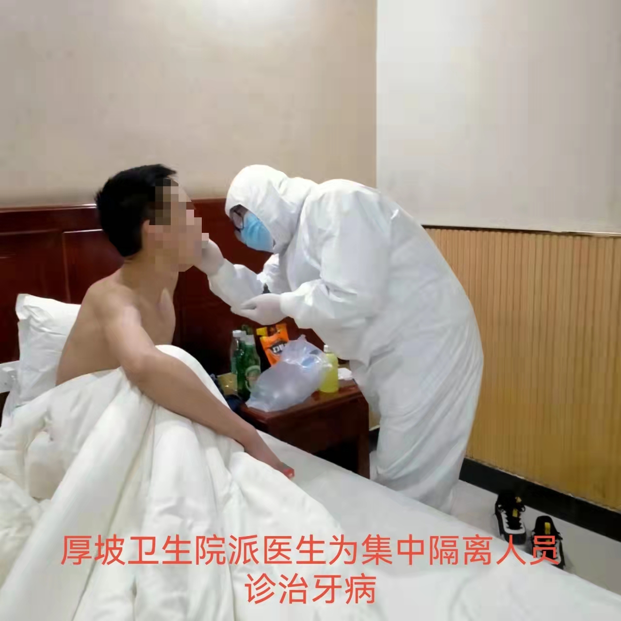 为解决部分返乡人员居家隔离难的问题,3月23日厚坡镇设立了集中隔离点。按照三区两通道设计,在隔离区楼道安装摄像头,每个房间上安装电子锁,实现全封闭全闭环管理;在楼梯拐角处设立值班点,预防人员走动。同时,“一对一”建立微信联络方式,方便为保障被隔离人员提供生活保障和思想疏导。截止目前,隔离点累计接收29人,已解除隔离14人,现有人员15人。3月24日晚,一名隔离人员突然牙疼难忍,经指挥部研判,由卫生院院长袁翔带人到隔离点303房间,为其实施了免费诊疗,使隔离者体会到党委政府的关怀和温暖。